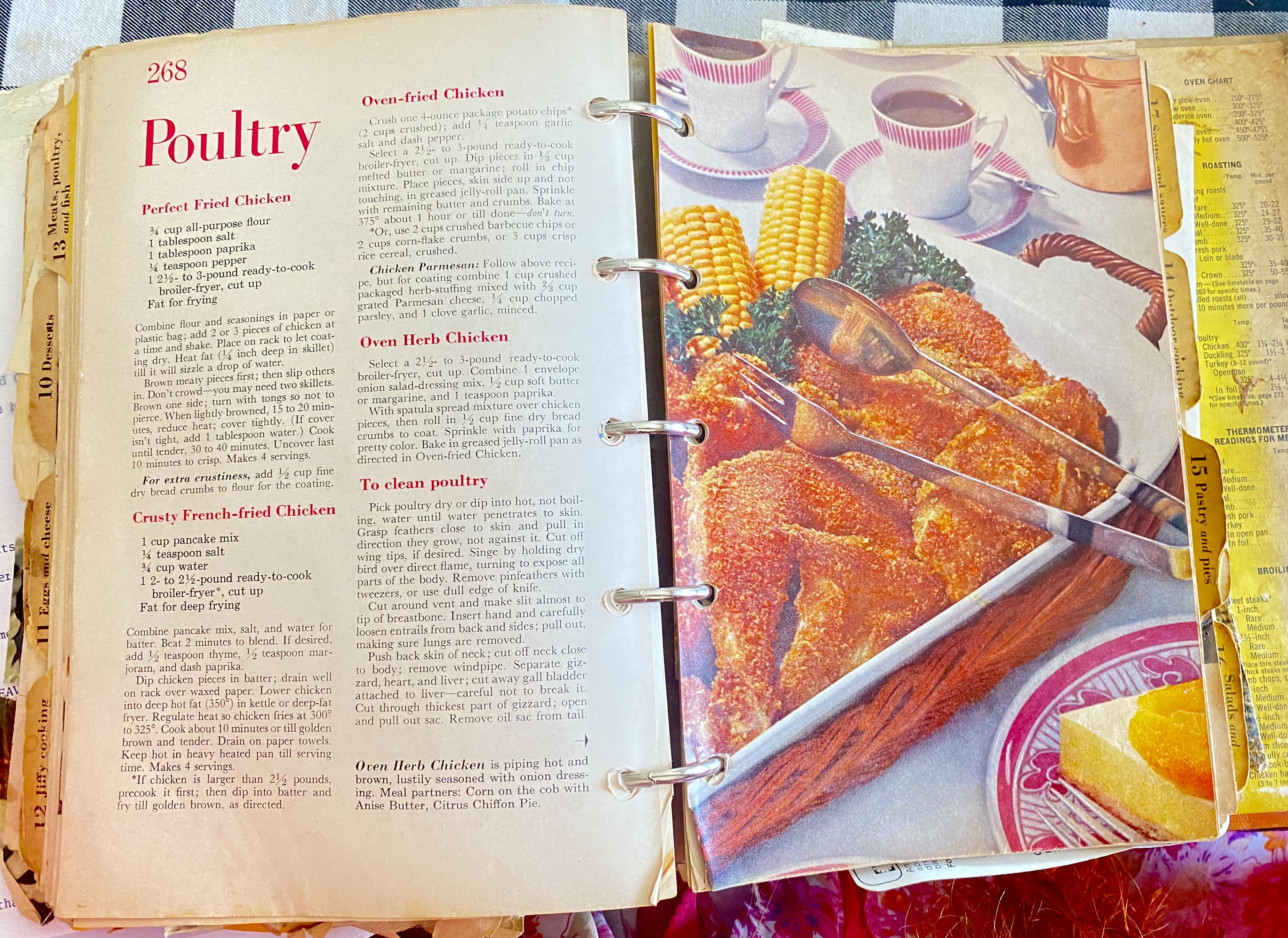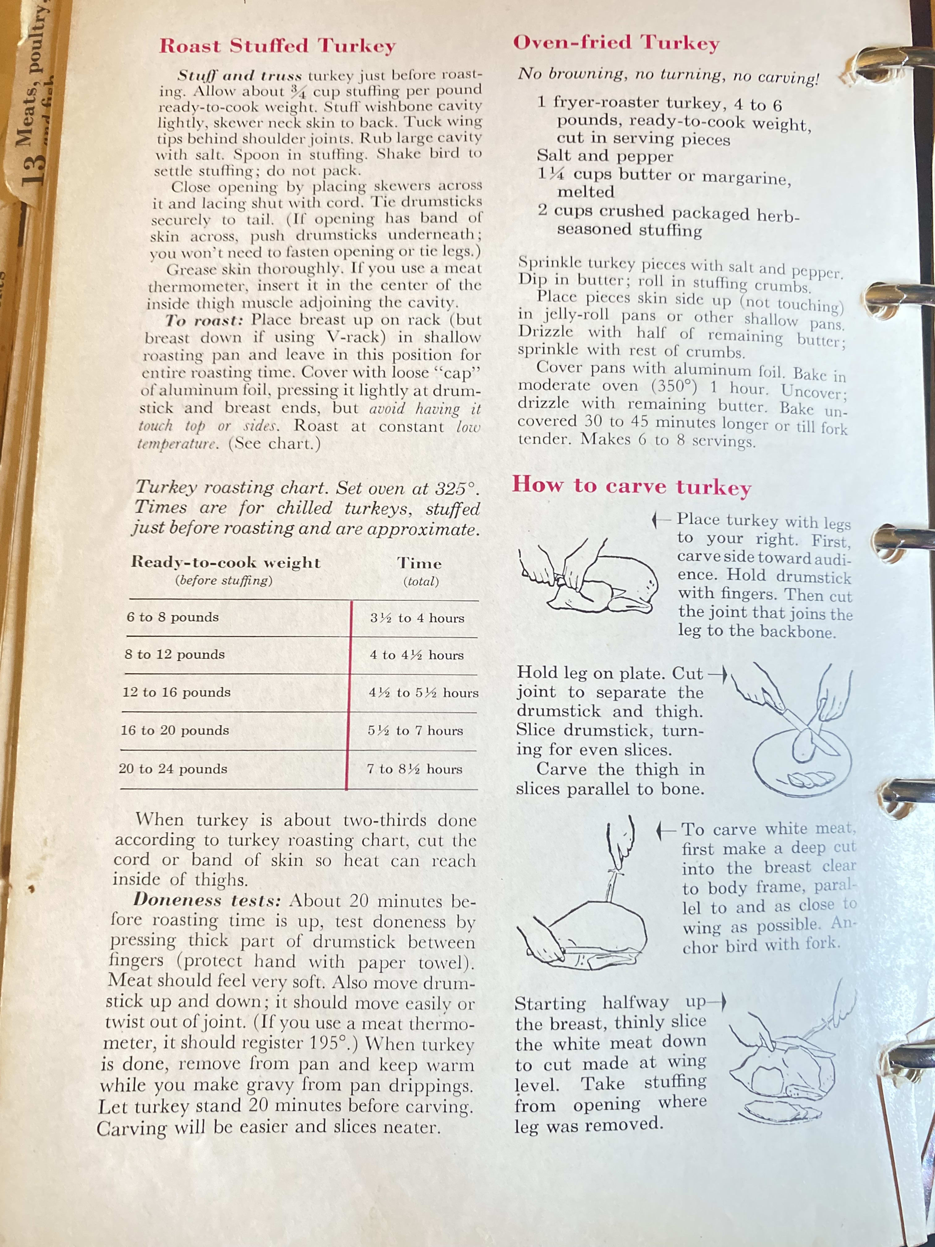 This new Cook Book is from 1950, and my Mother’s Soul is written in hereI have a particular love of Thanksgiving, because it is my Mother’s Holiday. The Feast of a gloriously basted Turkey with its crispy golden roasted wings, and its sagey cornbread stuffing was my favorite meal as a little girl, so much so that I asked for it on my Birthday as well. I loved my Mother’s stuffing, and for those who will quibble - yes, I know Dressing and Stuffing are two different things: