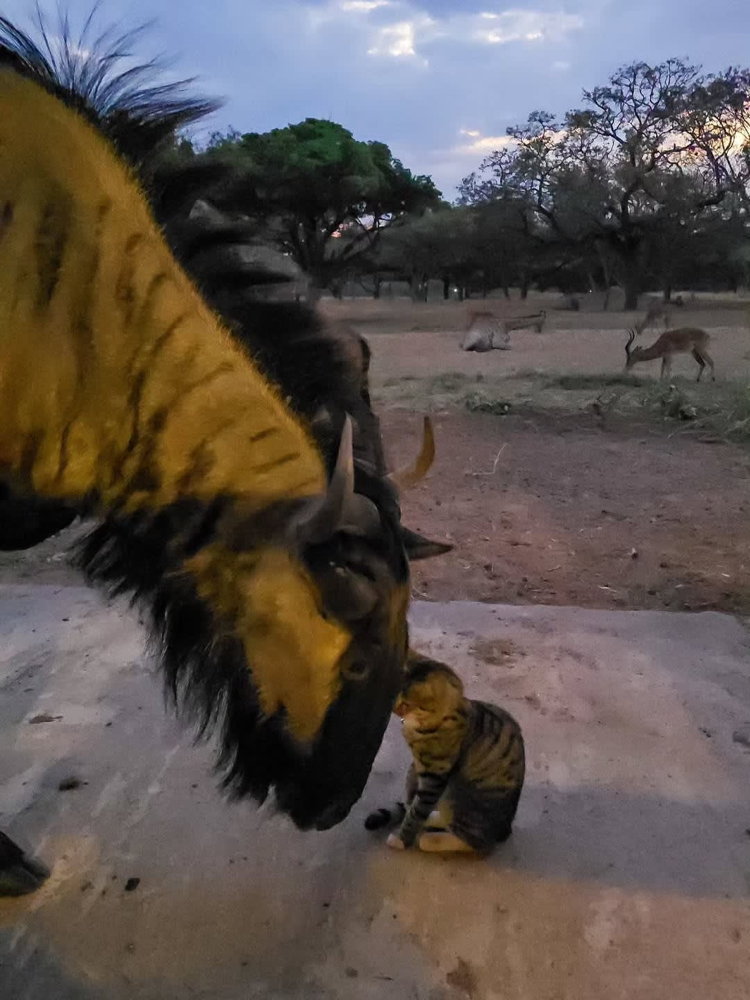 Photo: Noodle the wildebeest sharing a mind moment with Barney the kitten. Notice how Noodle’s eyes are high up his head. (Photo credit: @bosnian_girl_in_africa)