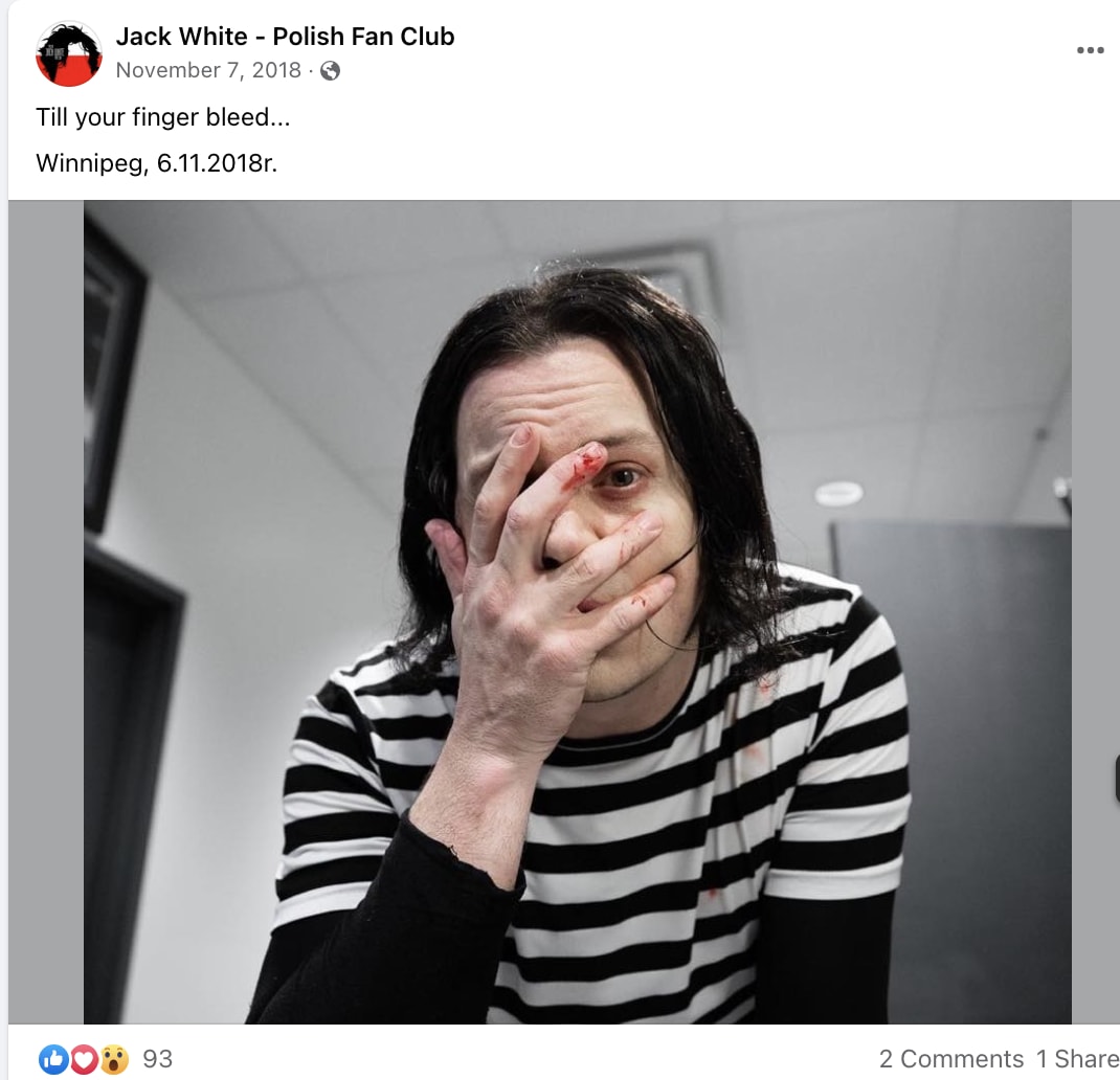 Jack White’s bleeding fingers, care of his Polish Fan ClubOf course its worth it. There’s something about the transcendence of pain, crossing that threshold between performance and just giving over to the command of the music, channelling some pure strain of rock’n’roll spirit. It’s the rock’n’roll equivalent of transcendental meditation or maybe speaking in tongues.