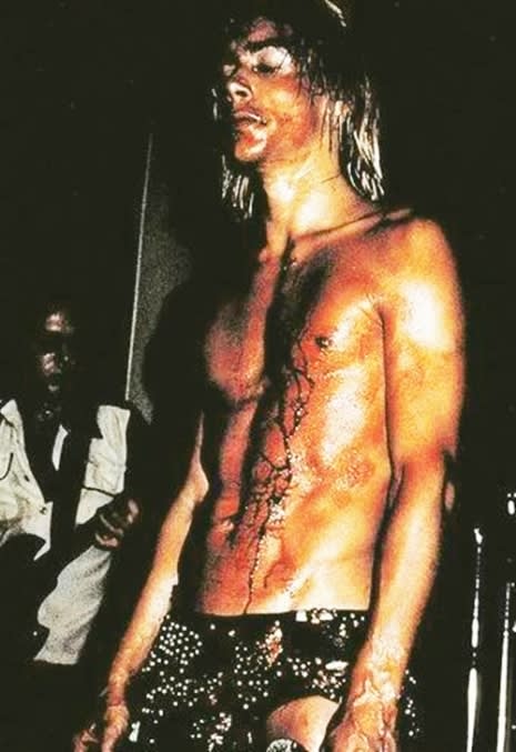 Kurt Cobain’s guitar at Reading Festival 1992First known sighting of Iggy shedding blood onstage occurred in 1969. He picked up a drumstick and dragged it across his chest until it began to leave welts, before digging deep enough to draw lines of blood. In fervid acts of almost self flagellation, a metaphorical kneeling at the altar of the music gods, the legend of Iggy Pop was partly built on his ability to literally crawl across cut glass and open up and bleed, like he did at Max’s Kansas City, whether accidentally or on purpose no-one is sure, becoming beatific in the process. Deified. At his first solo concert , in LA 1974, he asked the audience if they would like to see him bleed. They would. He had Ron Asheton whip him before carving an X into his own chest.
