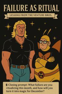 In The Venture Bros., failure isn’t the end — it’s the ritual that keeps the story alive. Each collapse is a chance to rebuild, laugh, and reimagine. In our own lives, failure can be reframed as sacred pause, a spell of transformation, a communal invitation to share imperfection.