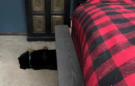 Minerva, confidently sleeping the sleep of a dog who isn’t usually allowed in the bed but gets to be here while construction is going on. That isn’t a comforter: it’s an extra sheet we’re using as a hair-barrier over our actual bedding. No, we haven’t finished dusting after sheetrock install. Don’t judge me.