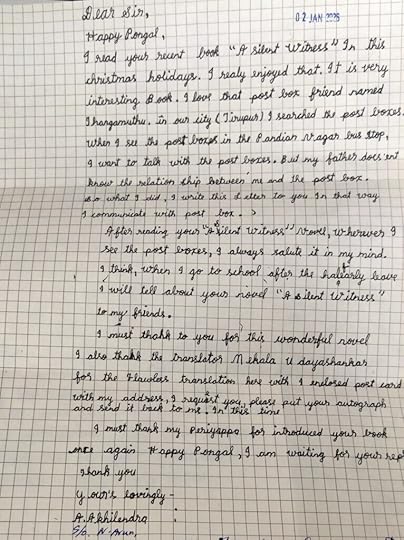 தபால்பெட்டி எழுதிய கடிதம் சிறார் நூலின் ஆங்கில மொழியாக்கம் வெளியாகியுள்ளது. அந்த நூல் குறித்த அகிலேந்திரா என்ற மாணவரின் கடிதம் தபாலில் வந்து சேர்ந்தது. அவருக்கு நானும் நன்றிக் கடிதம் தபாலில் அனுப்பி வைத்தேன்.