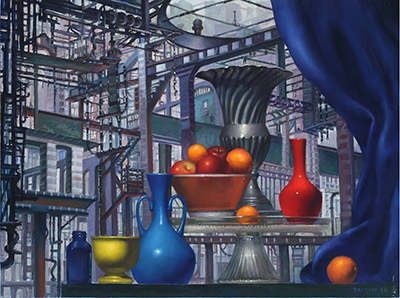 After leaving New York, Gary went on to found Seattle’s Gage Academy of Art with Pamela, where they kept alive a tradition of traditional art instruction in anatomy and classical painting technique. In his own painting, Gary very early left the figure behind. He said that since nudes were no longer quite an acceptable subject for art, or maybe because they’d been done to death, he would paint sensual pictures of pears and apples instead. Eventually, he moved on to a series involving steam trains. Even when painting fruits and vegetables, Gary could still find ways to work in perspective: