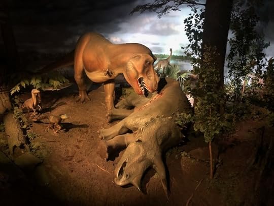 I saw a diorama of the Silurian period, depicting what Wisconsin looked like 410 million years ago—an ancient reef with cone-shaped, squid-like nautiloids swimming and hunting trilobites scattered on the seabed below them. Fast forward 35 million years later, and there is ichthyostega, a cute bugger of an amphibian, sticking its snout out of a plexiglass pond, contemplating dry land, and a full-size model of a stegosaurus, smiling benignly in the Late Jurassic another 240 million years after that. Crystals and meteorites, fossils and skeletons.