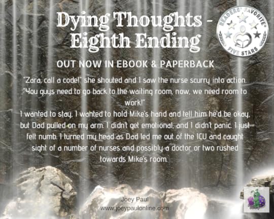 http://www.books2read.com/DTEE[ID: A waterfall background with the title DYING THOUGHTS - EIGHTH ENDING at the top and out now in ebook, and paperback just below the title The except reads: