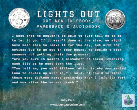 http://www.books2read.com/LOUT[ID: A dirty blue/green background with the title LIGHTS OUT at the top and out now in ebook, paperback, and audiobook just below the title The except reads: