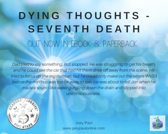 http://www.books2read.com/DTSD[ID: A bright blue background with the title DYING THOUGHTS - SEVENTH DEATH at the top and out now in ebook, and paperback just below the title The except reads: