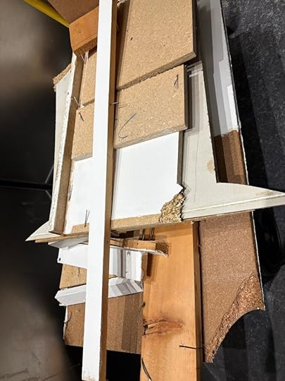 After work on Monday, I was able to get some of the destruction done on the stove side of the kitchen. What I left was very solid; it needed my circular saw to cut out. The rest came out quite easily with a hammer and chisel plus a crowbar. I was able to hold the chisel with my bad side. It wasn’t easy getting the pieces into one of the dumpsters, but I got it done. Thankfully, there wasn’t a lot to relocate from inside this cupboard, so that didn’t make my living situation too much worse.