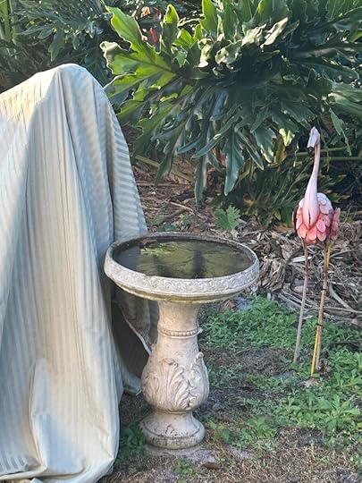 My Florida backyard enduring winter, complete with pink flamingo statuary, frozen birdbath, and covered Camellias to protect the buds.