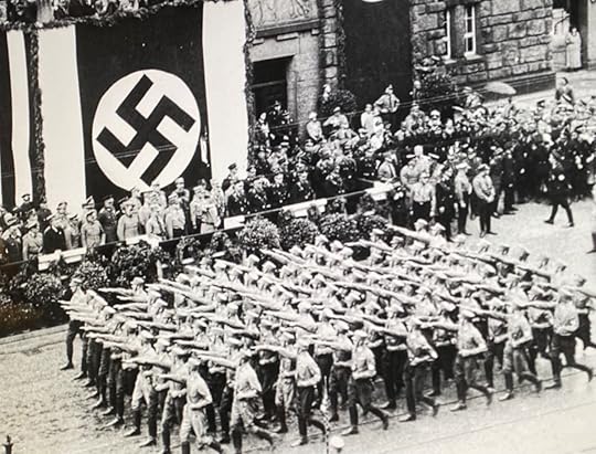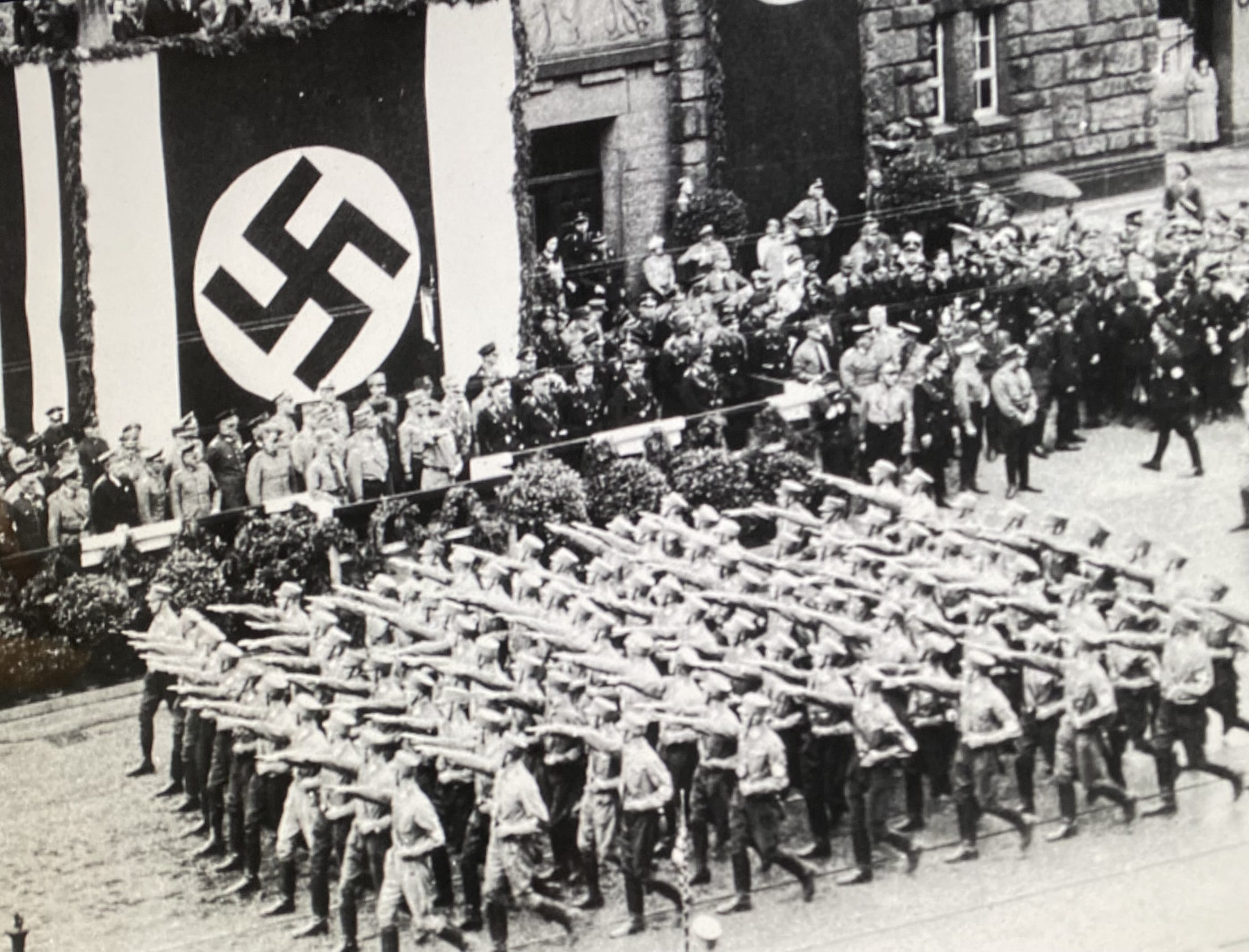 Battalions of Nazi Storm Troopers (Brown Shirts) salute Hitler during a parade through Dortmund, Germany, 1933.