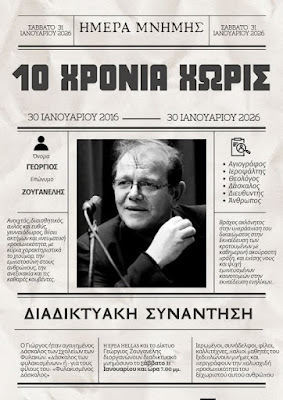 10 ΧΡΟΝΙΑ ΧΩΡΙΣ - ΕΚΔΗΛΩΣΗ ΜΝΗΜΗΣ Γ. ΖΟΥΓΑΝΕΛΗΗ EPEA Hellas σε συνεργασία με το Δίκτυο για τον Πολιτισμό & την Εκπαίδευση στις Φυλακές"Γεώργιος Ζουγανέλης" , σάς προσκαλούν σε διαδικτυακή εκδήλωση - μνημόσυνο με αφορμή τη συμπλήρωση δέκα χρόνων από τον ξαφνικό θάνατό του (30/1/2016-30/1/2026). Ο Γιώργος Ζουγανέλης, διευθυντής για 11 χρόνια του Σχολείου στη Φυλακή Κορυδαλλού, ήταν αγαπημένος Δάσκαλος όλων των Σχολείων των Φυλακών. «Δάσκαλος των φυλακισμένων» ή - για τους φίλους του- «Φυλακισμένος Δάσκαλος». Ιερωμένοι, συνάδελφοι, φίλοι, καλλιτέχνες, παλιοί μαθητές του ξεδιπλώνουν μνήμες και περιγράφουν την πολυσχιδή προσωπικότητα του ξεχωριστού αυτού ανθρώπου. Η εκδήλωση θα γίνει το Σάββατο 31 Ιανουαρίου και ώρα 7.00 μ.μ. στον σύνδεσμο: https://us06web.zoom.us/j/83377930109...