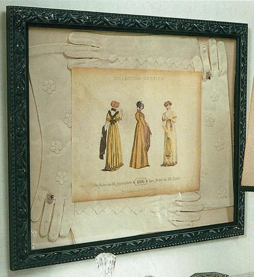 I’ve seen a lot of Regency-era fashion prints over the years, but the framed print in this photo uses ladies’ long gloves to create a beautiful mat for the old magazine color plate of fashionable costumes.