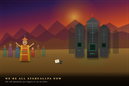 Here’s your allegory rendered in a parchment-and-silicon style. The composition sets bewildered ordinary people on the left — Atahuallpa at the center with arms raised in that universal gesture of “what the hell is happening” — facing a phalanx of GPU server towers on the right, styled as conquistadors with helmet crests and cross-shaped motifs on their dark metal bodies. Green circuit lines pulse like a digital heartbeat.