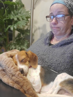 Loki, the new puppy, is settling in nicely. My lap (where my laptop should be) is his favorite place.