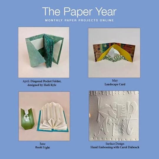 The Paper Year is a membership group – a wonderful community of paper lovers. In April-June, we’ll be exploring Hedi Kyle’s Diagonal Pocket Folder, a Landscape Pop-Up Card, and a Book Light. We’ll also have a Zoom visit with Mia Semingson of Two Hands Paperie (an amazing paper shop in Boulder, CO) and a surface design workshop featuring Hand Embossing with Carol Dubosch. I hope you’ll join us!