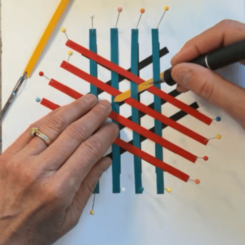 In honor of my new book, Weaving With Paper, I’m featuring the many artists whose work appears in the book, including professional paper weavers and artists who have participated in my Weave Through Winter online class. This week I’m featuring something different, because I did a paper weaving demo for Ali Manning, who runs Vintage Page Designs and the Handmade Book Club. You can catch the replay here – we talked about the book, and I showed how to make a hexagonal weaving with paper strips.