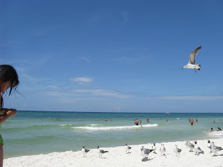 Well, we’re back from a wonderful vacation in Florida. I feel energized and refreshed from my time near the ocean. We went to the beach every day we were there and played in the waves. The water was clear and we could see fish swimming around us and could gather shells from the sand under the waves. It was really, really nice. That’s a picture of my daughter above, feeding the seagulls.