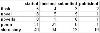 I seem to be much better at starting novellas than I am at finishing them - the only completed one is Adrift on the Sea of Rains, which I published through Whippleshield Books. Most of my poems I've posted on sferse, but I've only tried submitting a handful (without much success, it has to be said). And, while I've finished five novels, I've only submitted two complete ones to my agent; the remaining three were proposals. The above figures do not include the short stories, novellas or novels I plan at some point to have a go at but presently have nothing more than a one-line description in my ideas book.