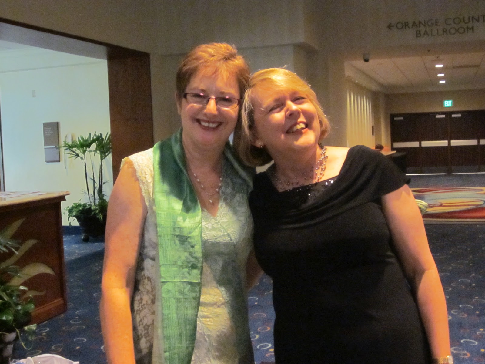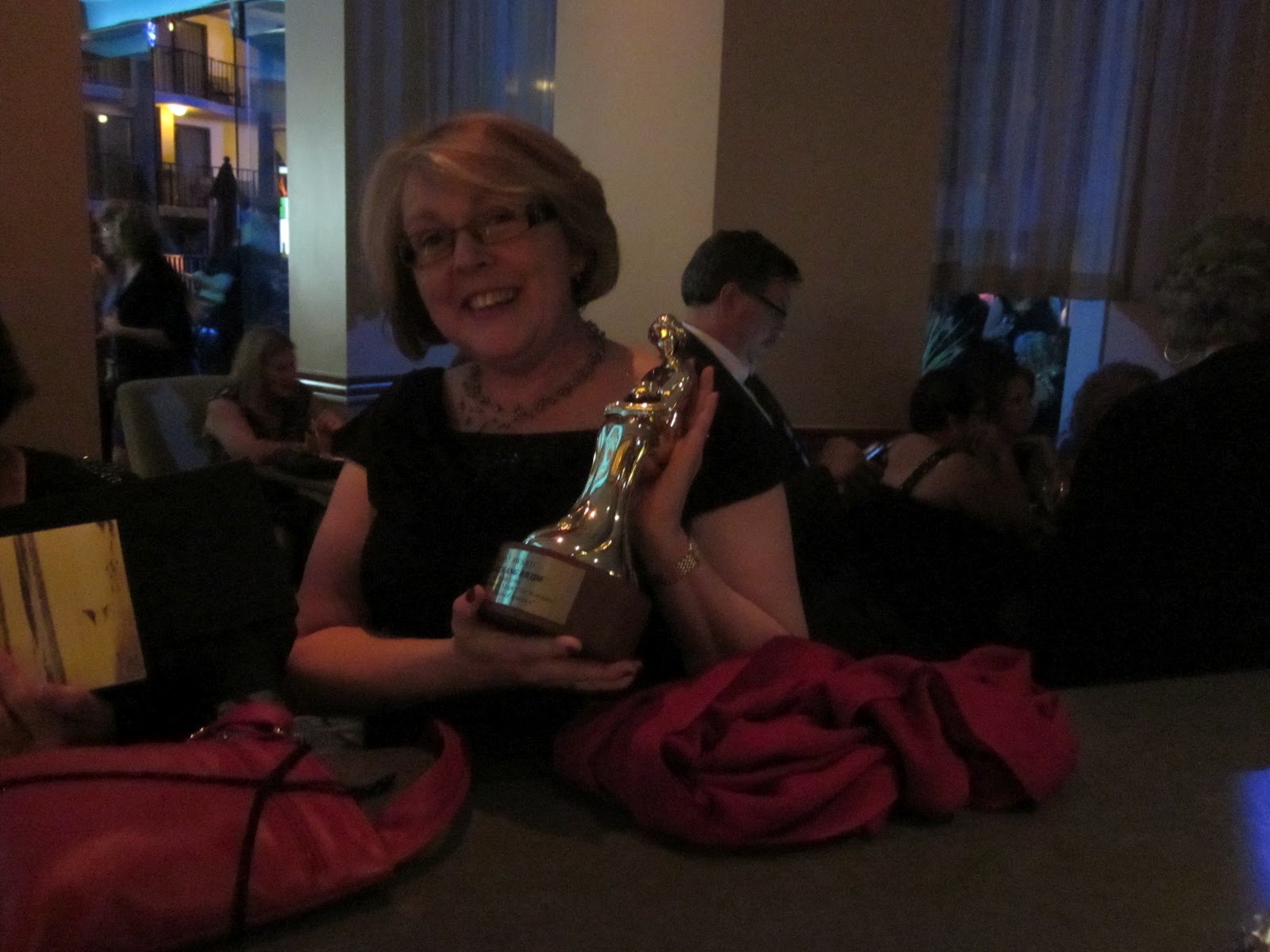 Fiona and her editor, Angela James with good luck dessertLike everything about the conference, the Awards were incredibly well organised. Golden Heart and RITA finalists had spent 2 hours in rehearsal that afternoon and we were all seated at tables at the front of the room. The MC was the delightful Victoria Alexander and was interspersed with little pastiches of our favourite romantic moments on film. Golden Hearts (for unpublished MS) went first and then the RITAs.  Other Aussie nominees Christina Brooks and Trish Morey missed out and then came the Single Title Contemporary Romance category.  Fiona had no expectations of winning and when her name was called out she sat there in complete disbelief. I was no help...jumping to my feet and screaming like a teenager at a Bieber concert.   As I may have mentioned Boomerang Bride was one of my favourite summer reads and thoroughly deserving of its win. The other big positive for this win is that it is a "digital first" ie it came out solely as an ebook. It is now in print.