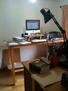 I also prefer to work standing up most of the time, and have two standing-height desks – one for the computer, and one for the drawing board. I’ve had the computer on a normal desk because this room was supposed to be a temporary measure . . . that’s now been in place for nearly two years.