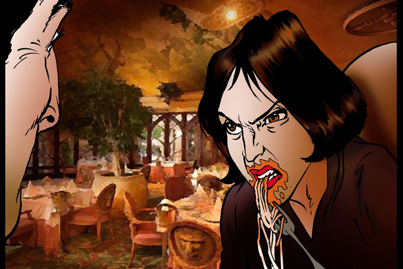 غادة تدسّ المكرونة في فمها كما ينقلون للفيل الدريس ـ (رسوم فواز) ـ