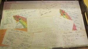 It’s a collage I made of index cards from my grandma’s recipe box, all in her handwriting, which makes them priceless to me. The cards are under glass on a serving tray that leans against the wall on a shelf in my kitchen where I see it every day.