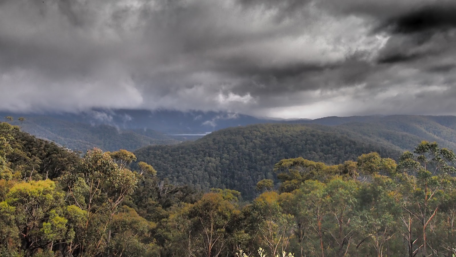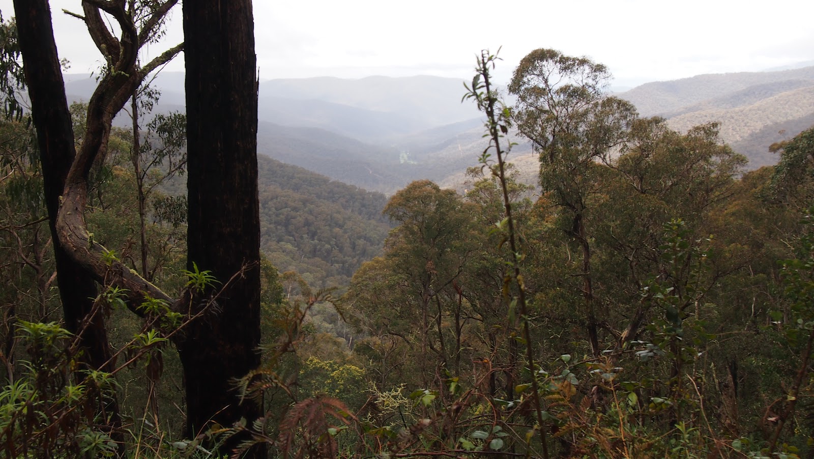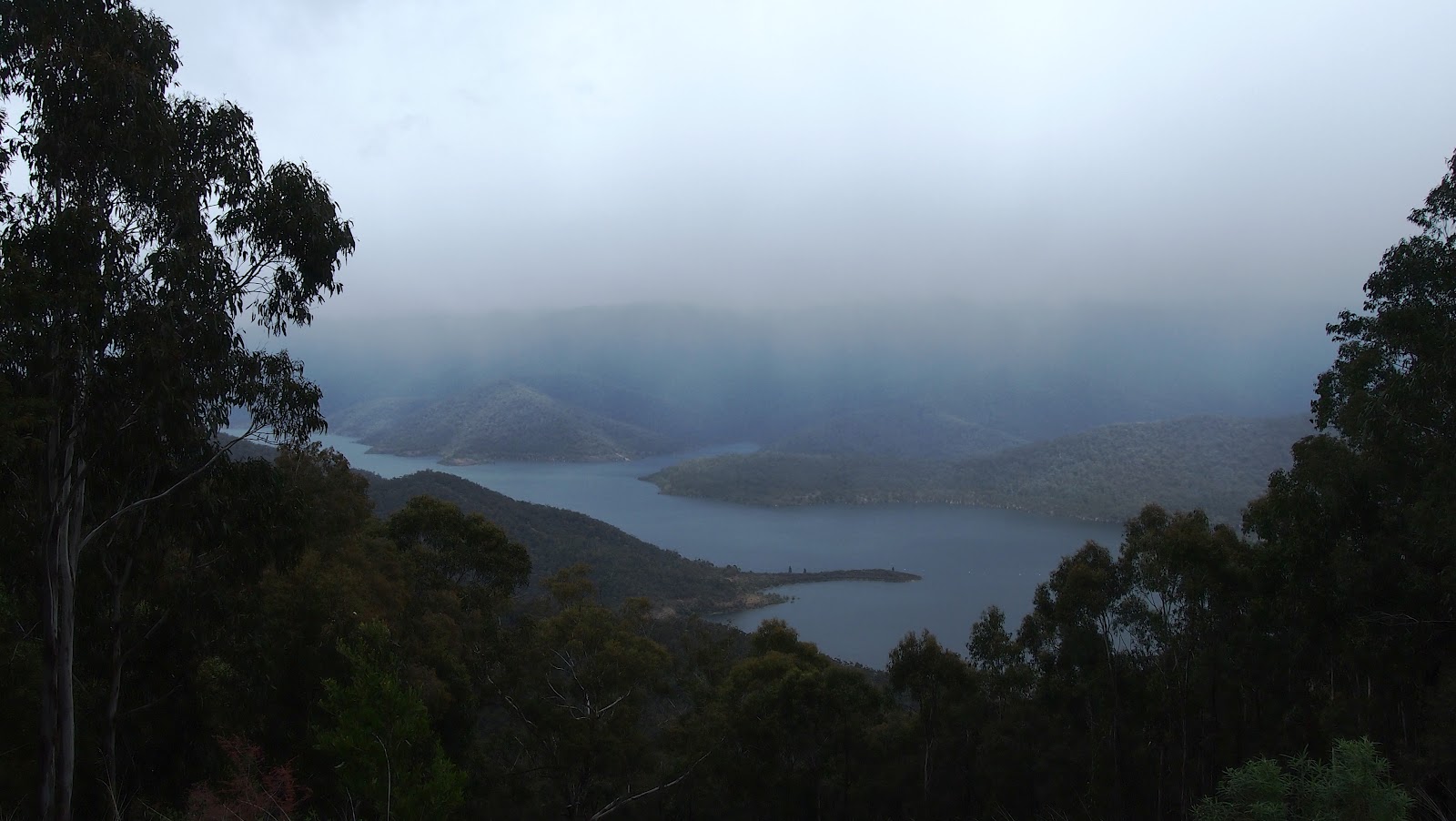 We pause to look down at the Thompson Dam, ringed by its blue hills and now nearly filled. The air smells of damp gum leaves, cold and fresh.