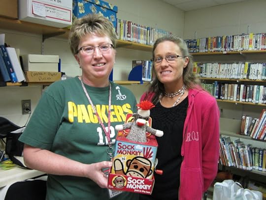 During my final day of visits, Lemonweir librarians, Cindy and Laurie, presented me with a Sock-Monkey-In-The-Box! My sock monkey, George, is a teeny bit jealous of the new guy--hee hee!School librarians love to monkey around! :)