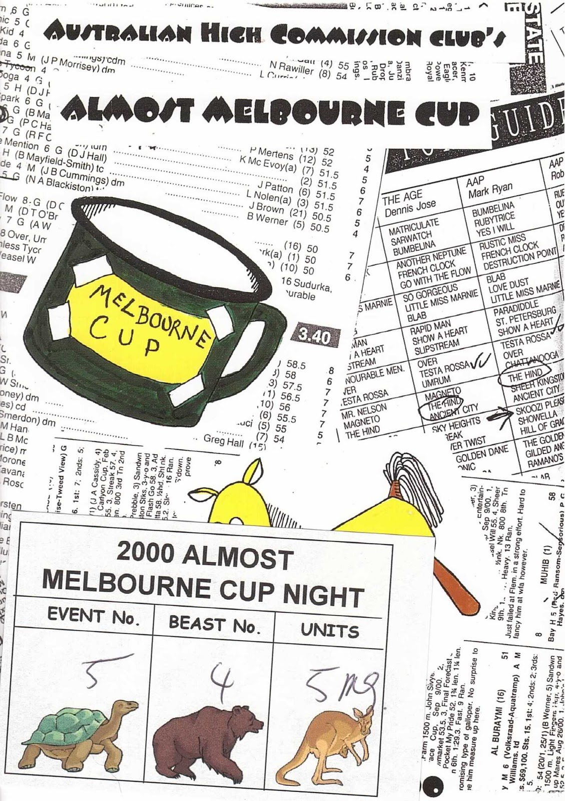 Almost Melbourne Cup Program 2000As careers advanced along came the invites to the "Corporate Tent". I loved the corporate tents - a chance to dress up and watch the races in civilisation rather than scrumming with the drunken crowds. Horses? Who cared about horses? I was there for the champers... One of these invites resulted in a flaming row with DH who told me I had a choice between a new hat or "educating your children" (yes, dear, that is still recorded in my black book!). In a scene oddly reminscent of nascent colonialism we paid for the privilege of course. The executive wives found themselves seated with the wife of the "country manager", an opinionated American who held court between races with complaints about the pokiness of her house in Toorak and the difficulty in getting good staff. That was probably the last time I attended the Melbourne Cup.In 2000 we moved to Singapore and as I may have reflected before, the importance of "tribe" becomes paramount when you are away from your native shore. That year, in the innocent days before the events of 9/11, the Australian High Commission hosted its annual "Almost Melbourne Cup Night", a charity night that raised money through "betting" on a 7 set race meeting run using wind up clockwork animals - penguins, elephants etc. It was the last time the "Almost Melbourne Cup" was run at the Australian High Commission. The following November, the world still reeled from 9/11 and the barricades had gone up outside the AHC, a building that was found to be on the "hit list".