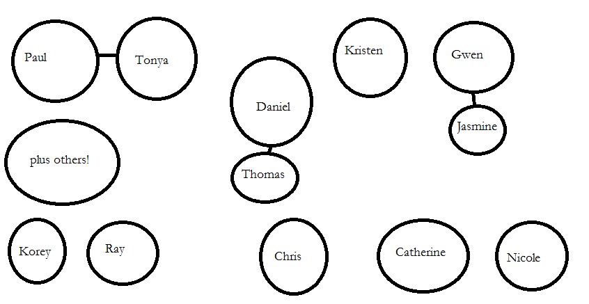 I have also made a small graph to display the basic relationship clusters. Yay for microsoft paint. :)