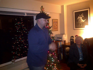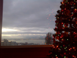 Christmas Eve: Here is dawn coming up over Eliott Bay, outside my apartment window, with the Christmas tree reflected in the glass. If I didn't wake up so effing early, I wouldn't see dawn.