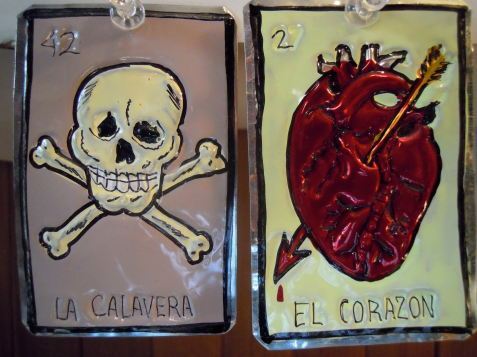 These two tin plates are Loteria pictograms I got from Tesoros in Austin. La Calavera is The Skull, although to me the image is more about death. El Corazon is The Heart. These are on the shelf right in front of me, and I look up at them frequently when I get stuck. Basically they tell me, Remember that the stakes are high. Remember to write from the heart. I need to remind myself of that a lot.