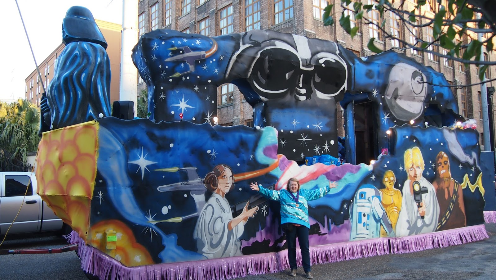 a friendship that has dated since we were both the nerdy kids with funny accents in a new school in Australia), met us at New Orleans airport and took us straight to the float staging area where the throws were being loaded. Naively I had assumed this to be a large warehouse with busy people loading throws on to floats. It was a dark, deserted street in the old port area down by the Mississippi. We bumped down pot holed, unlit roads and over rail lines to where the dark silhouettes of the floats loomed against the sky. The always prepared Aussies had torches so we carried AK's bags of throws down the long, ominous line of floats where weird faces loomed at us from the dark and no other living soul seemed to be around.