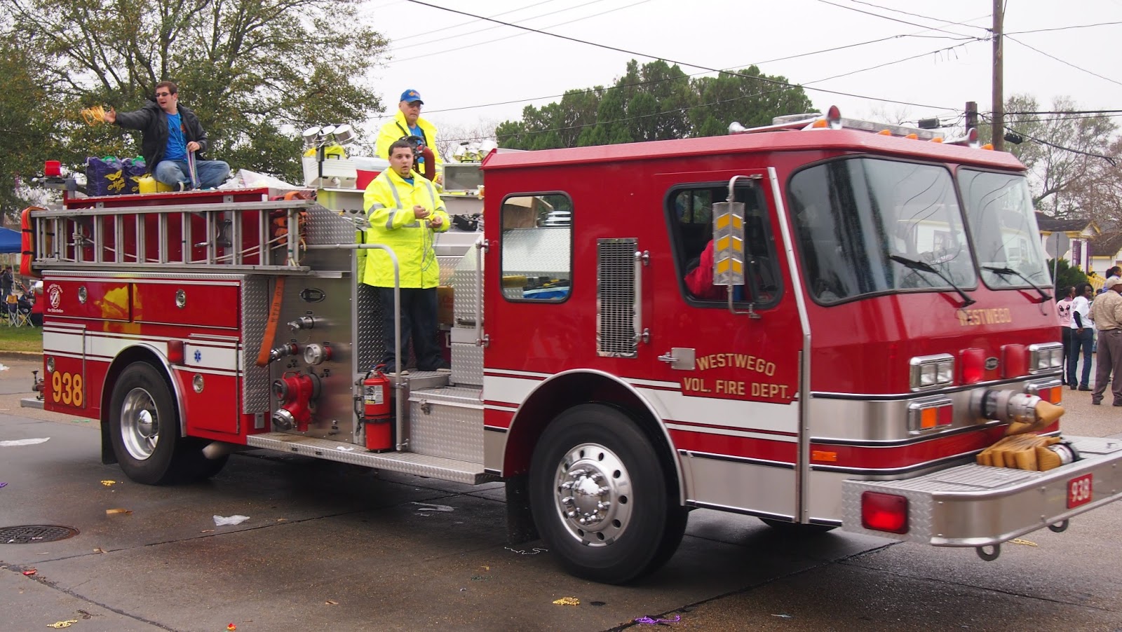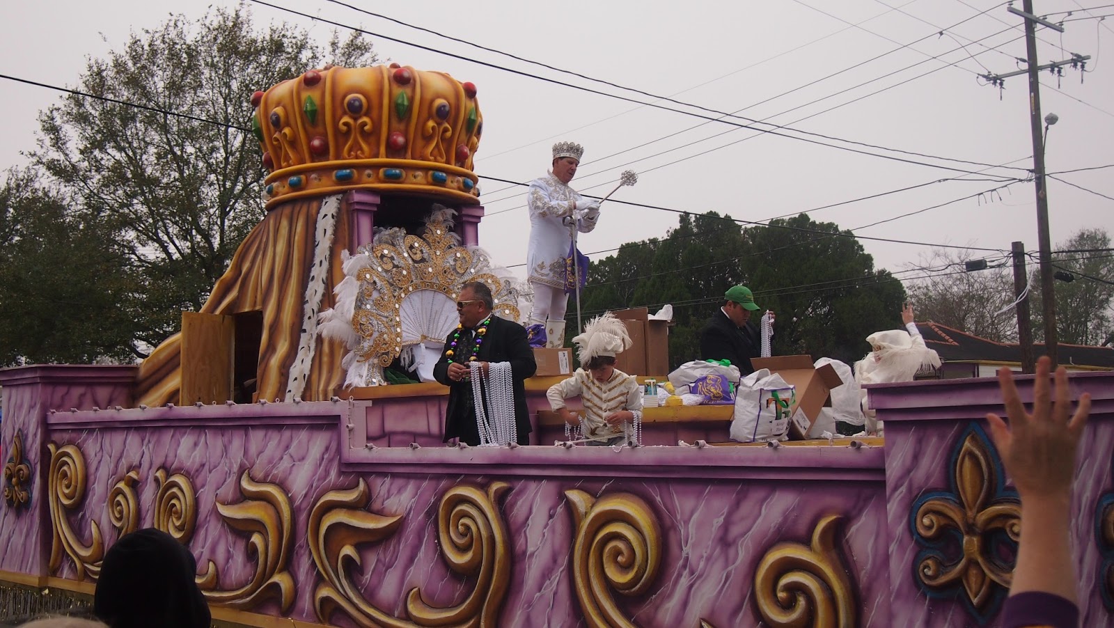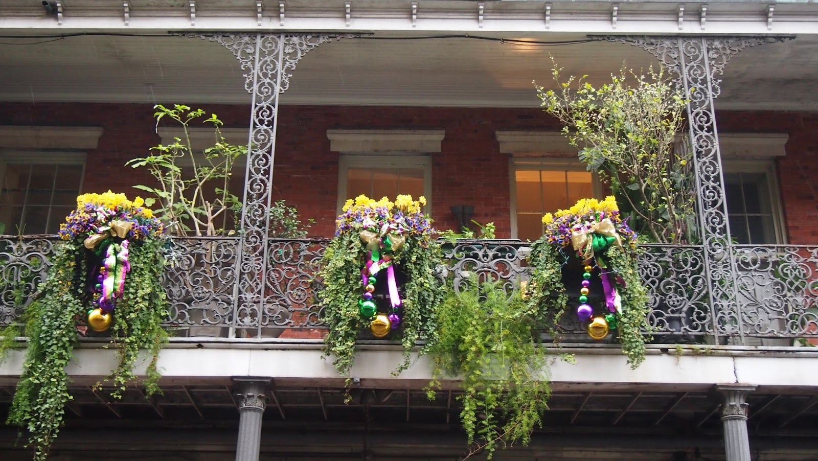 Mardi Gras decorations - French QuartersTuesday was Mardi Gras day. In the city the Krewes of Zulu and Rex were parading. We watched the parades on the television before joining our friends at a local parade for the Krewe of Grela in the Gretna Parish. Here the local fire department (yes fire trucks!), the sheriff and local councillors joined the parade, tossing throws, cups and doubloons. The King and Queen of Grela passed by and the local high school marching bands, entertained us. I stood on the side of the road, my own hand upreached... "