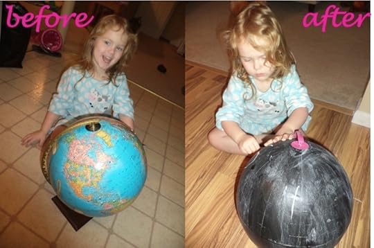 First, I picked off the rhinestones, much as I was sad to see the intriguing markers go. (Tot loved this part, as it gave her many “sparklies” to hoard and play with.) Then I spray painted the base and frame. I chose hot pink, partly because it’s Tot’s favorite color. But also…I had a can of hot pink spray paint. So it was free. I’m thrifty (read: cheap) like that. After letting that dry overnight, then cure for two days, I used some leftover chalkboard paint from another project and carefully painted three coats of chalkboard paint over the globe.