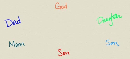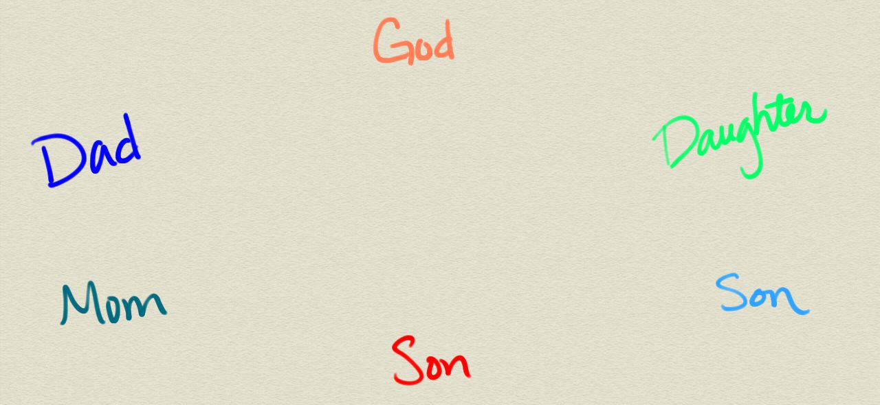 We began by putting each family member's name on the white board. To make it a little more fun everyone got their own color. We included God, so we have 6 people in our relationship map.