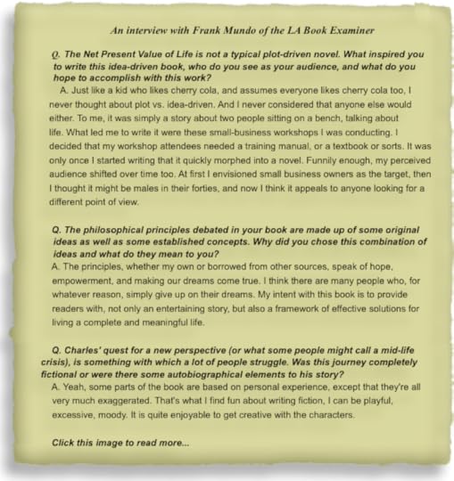 It's not often that someone asks thought-provoking questions of this caliber (at last not to me). In case you missed it, here's an interview Frank Mundo, of the LA Book Examiner, conducted just two weeks ago.