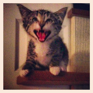 Today, I’m inspired by my cats. Less than a week ago, we adopted a new kitten, Pele. She’s been bunking in her daddy’s office while the big girls, Morgana and Luna, get used to the new addition. Tonight, they finally met face to face. Or rather, the baby hung out in the carrier while the other two stalked around to observe (and hiss at) her. Do you know what Pele did? She scrambled to the front of the carrier and scratched to be let out so she could play with them. We didn’t name her after a fire goddess for nothing! She’s absolutely fearless, as displayed by this incident as well as this morning’s antics: she climbed all the way to the top of her cat tower for the first time despite being unable to climb back down. Sure, she had to ask for help in returning to the ground, but it won’t deter her from doing it again!