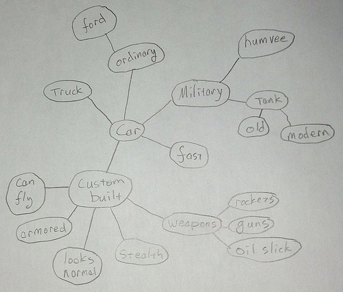 So I start with a blank piece of paper and a question. What kind of car does the hero drive? Then I write all possible answers that come to mind without culling them for absurdity or whether I like the idea. Sometimes the act of writing gives me more ideas, I write everything down. The idea that he might have a tank, leads to the idea that it could be a military vehicle and I write more bubbles for different kinds of military vehicles.
