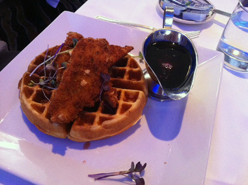The menu had your typical brunch items along with fishy things like crab cakes. Oh, wanna know how I know the chef is Caribbean? Because there’s a jerk chicken sandwich on the brunch menu. And also, he told me so a while ago. And I read it somewhere too. You know what wasn’t on the menu, though? Bacon. But we ordered it anyway, because we assumed they just forgot to add that in there. For my entree, I had the chicken and waffles, because my love for it is the blackest thing about me besides dodging bill collectors. iOS 7 finally made it easy to block a number from ringing, which means you’re never getting that $127, DirecTV. Dana surrendered herself to the French toast.
