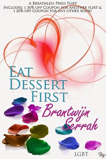 The Book "Eat Dessert First" is a very short read. Coming in at just 2.5k it was one of the quickest things I could get my hands on. A mere twenty minutes later, and I was done. (Perfect while waiting at a doctor's office.) It is from the LGBT line and you can tell that by the rainbow rose petals on the cover. Each Flirt category has the same basic design and the colors of the petals help distinguish the category, but if you are ever in doubt about what you're getting, each category is also tagged on the cover of the book as well.