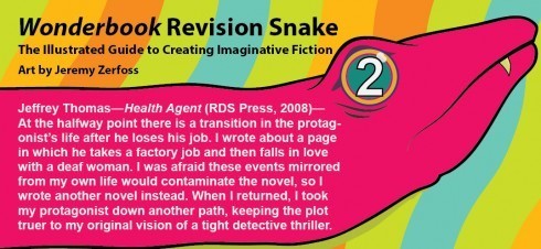 And I myself have a little contribution, in a section on revisions. Along with other writers such as Peter Straub, I was asked to describe an instance of revision to one of my works. I recounted a radical change in direction I took at the halfway point of my SF thriller HEALTH AGENT (released in 2008, but written between 1987-1989). My comment appears as a “revision snake,” in one of the sizable book’s innumerable clever and original sections.