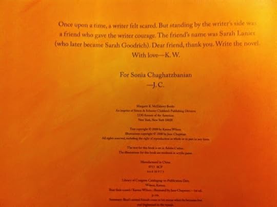 Once upon a time, a writer felt scared. But standing by the writer's side was a friend who gave the writer courage. The friend's name was Sarah Lanier (who later became Sarah Goodrich). Dear friend, thank you. Write the novel. With love- Karma Wilson