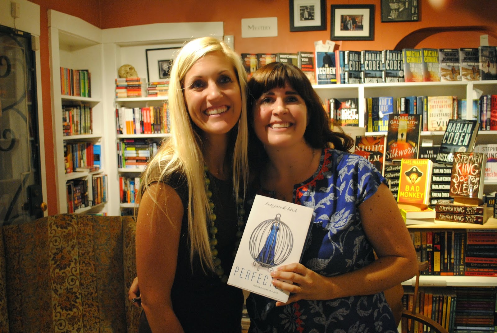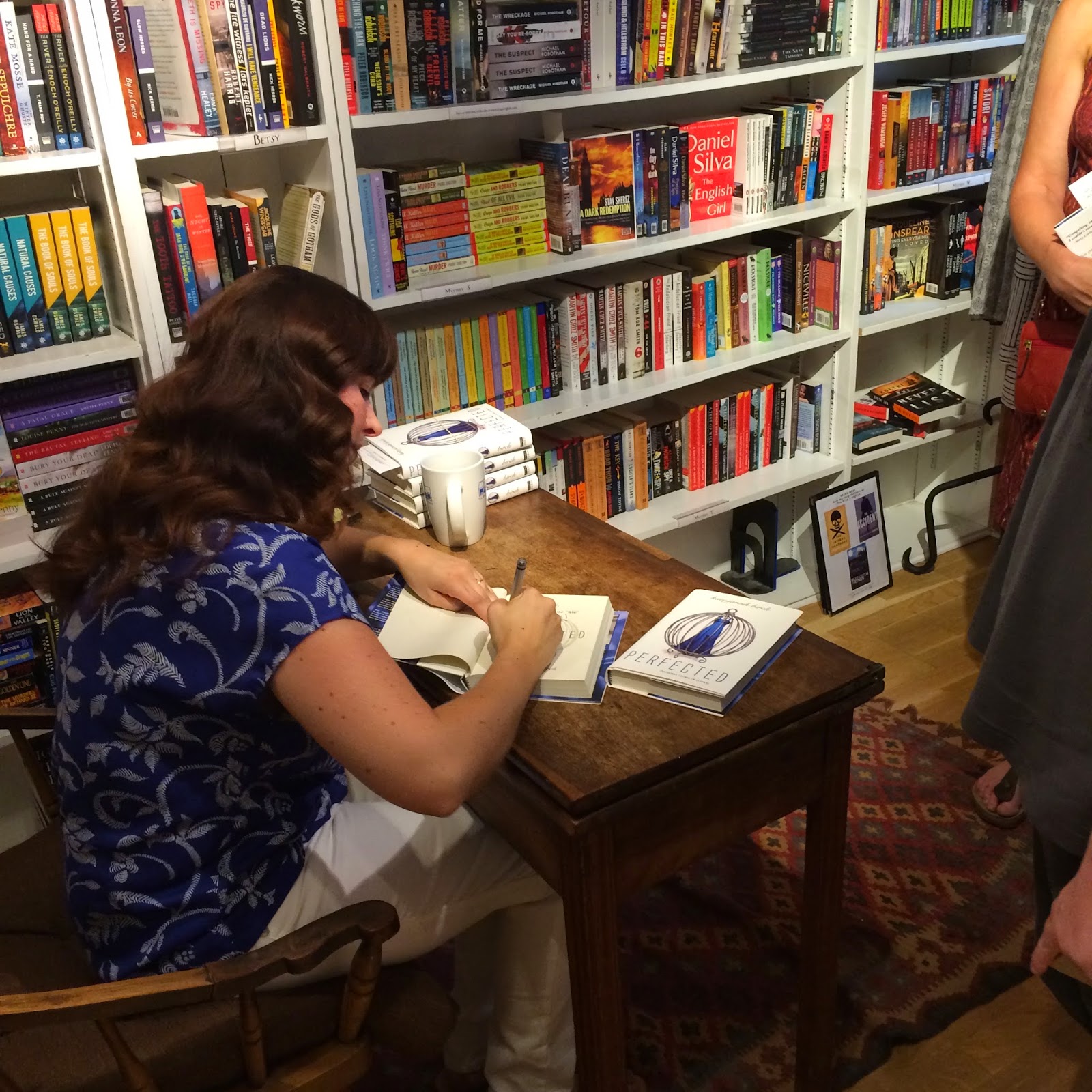 I walk past the bookstore all the time and it was so exciting to see my name on the sign out front. Hopefully I didn't make too much of a fool of myself. I talked about where I got my idea for PERFECTED and shared a bit about my bumpy path to publication. It was fun to see friends, family and even a few new faces in the crowd. I didn't get a chance to see the line for signing, so I'm glad my daughter snapped some shots for me. I was at the top of the stairs in the "mystery" room. My sweet friend Anne, who also happens to be my very first writing partner. We used to sit in my room writing and I was always jealous of her stories. Gotta love my crazy crew! So supportive!