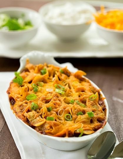 Spread 2 cups of Fritos in 8x8inch baking dish. Sprinkle half the onion and half the cheese over Fritos. Pour the chili over the onion and cheese. Sprinkle the remaining Fritos, onion and cheese over the chili.