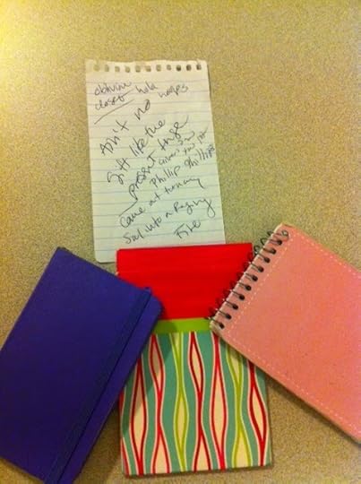 I carry three writing notebooks with me at all times. The purple one is for quotes. I've been keeping a quote book since freshman year of high school. The striped one is for writing. The pink one is for things like "BAKE MUFFINS TOMORROW." Most of the time I end up scrawling song lyrics, hoping to find the song later. That's what most of that sheet is covered with. However, it also says,Oblivion closet hula hoops.