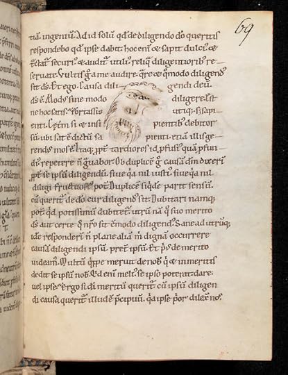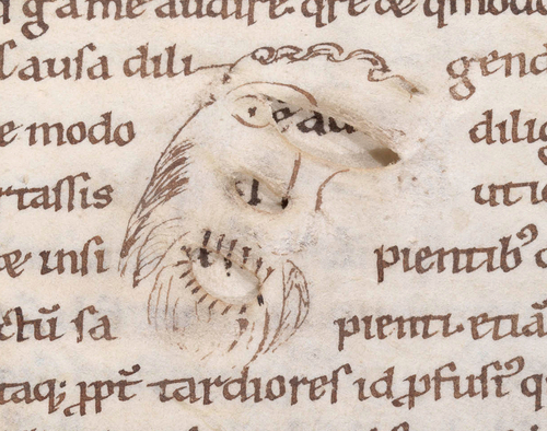 Here’s something special. Last Friday I posted a blog on holes found in the pages of medieval books (The skinny on bad parchment). As in the image above, such defects are usually caused by the parchment maker: he pushed his knife too hard cleaning the animal skin, causing it to rip. While the resulting holes must have been a major annoyance to producers of books, the scribe of this twelfth-century manuscript used them to his advantage. He drew a bearded man while turning the gaps into an eye and a nose (slightly displaced), as well as a big laughing mouth. The reader of this serious text - a commentary to the Song of Songs - will no doubt have laughed at the unexpected sight of this funny stranger. Making art out of flaws: it’s just the perfect image, then and now.