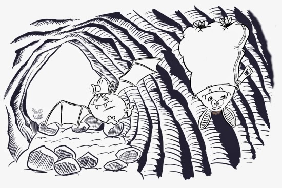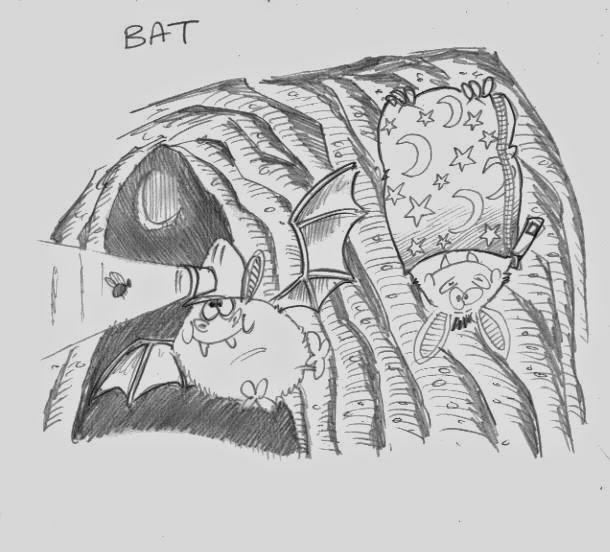 The sketches, having been scanned into the computer are then brought into my favourite computer program in the world, (until they invent a custard cream program) Corel Painter. The process for all these illustrations is the same so for this example, bats, the sketch is enlarged to the size of the finish artwork. I then “ink” over the sketch using a Wacom tablet. No brushes or pens were harmed in the making of these illustrations, the inking is done digitally using a couple of “brushes” in the program that mimic actual real media. One big benefit of inking this way is that I can separate foreground and background elements, which is a huge plus if I then colour the lineart in a different colour.