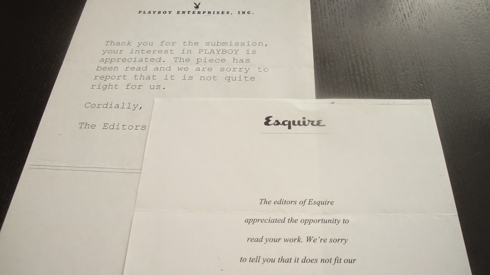 I remember receiving the letter of acceptance. Back then every submission consisted of a sheaf of papers – never stapled together upon pain of rejection (I have always preferred those pretzel-shaped ideal clips) – with a self-addressed-stamped-envelope that you charmed to repel form rejections. In the garage somewhere I have half-empty return address mailing labels for three different addresses. Today young writers would have to print out their rejection emails to have a collection from the world’s great literary journals to nail above their writing desks – I have actual paper rejections from Esquire, Playboy, Ploughshares, and more.